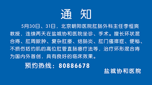 2020年5月30日、31日,北京朝陽(yáng)醫(yī)院肛腸外科主任李恒爽教授,坐診鹽城德馨醫(yī)院。